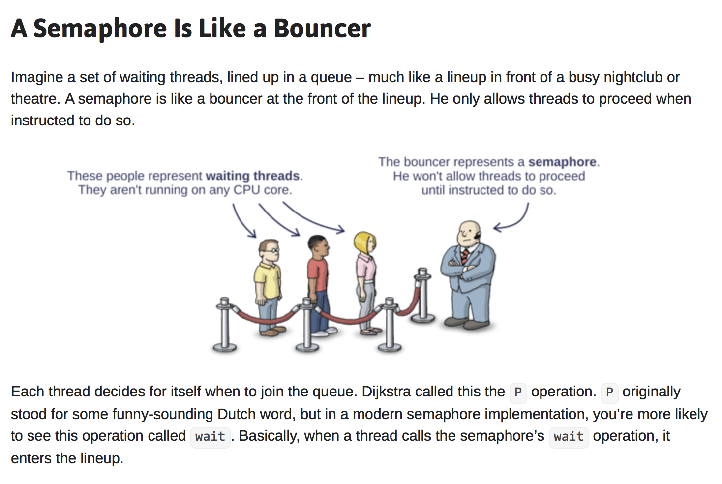In multithreaded programming, it’s important to make threads wait. They must wait for exclusive access to a resource. They must wait when there’s no work available. One way to make threads wait – and put them to sleep inside the kernel, so that they no longer take any CPU time – is with a semaphore.