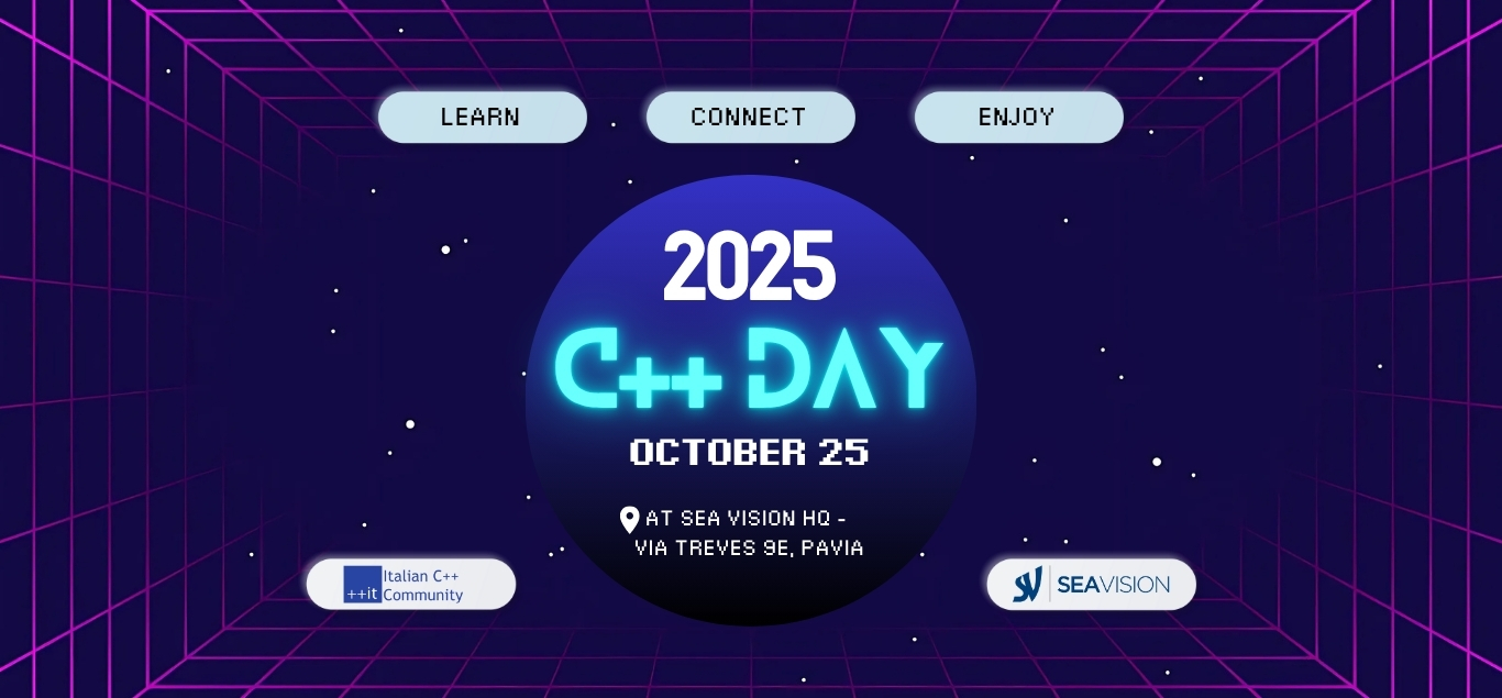 The C++ Day 2025 will be held in person on October 25 in Pavia, a joint effort between the Italian C++ Community and SEA Vision, who is also generously hosting the event at their venue.